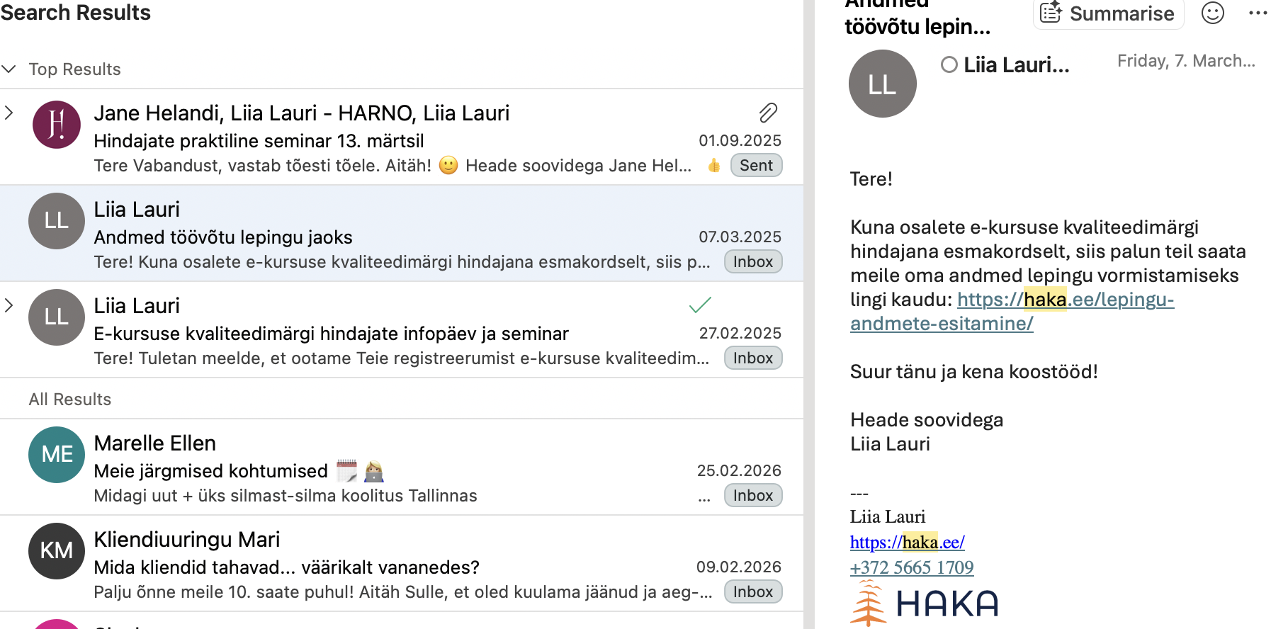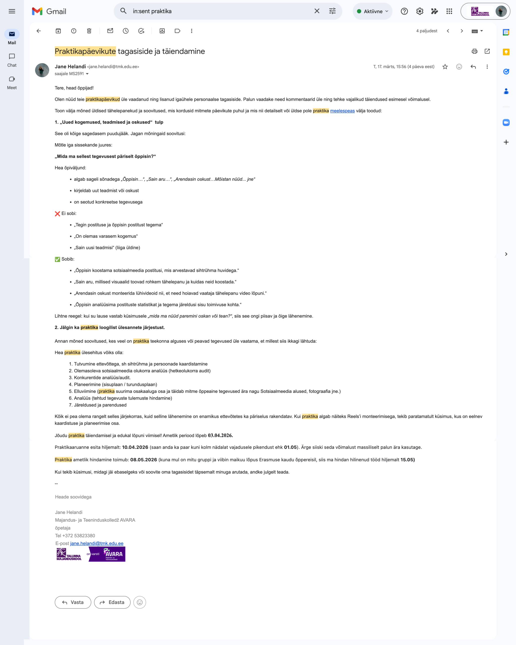 praktikajuhendamise või mentorluse näide e-kirja teel suhtlusest.